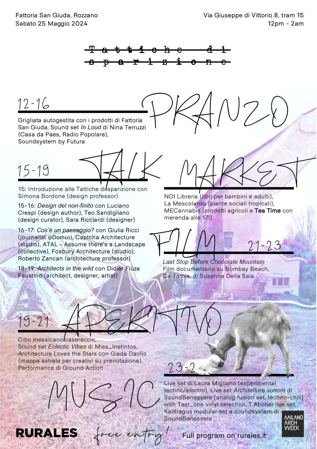Frammento di campagna rimasto impigliato fra infrastrutture, complessi residenziali e commerciali nell’area metropolitana di Milano: da un luogo di margine urbano, la proposta culturale vuole ragionare sull’autodeterminazione, l’autocostruzione e rigenerazione degli spazi agricoli, in equilibrio fra progetto e abbandono, sulla scia delle “tattiche di sparizione” teorizzate da Hakim Bey.